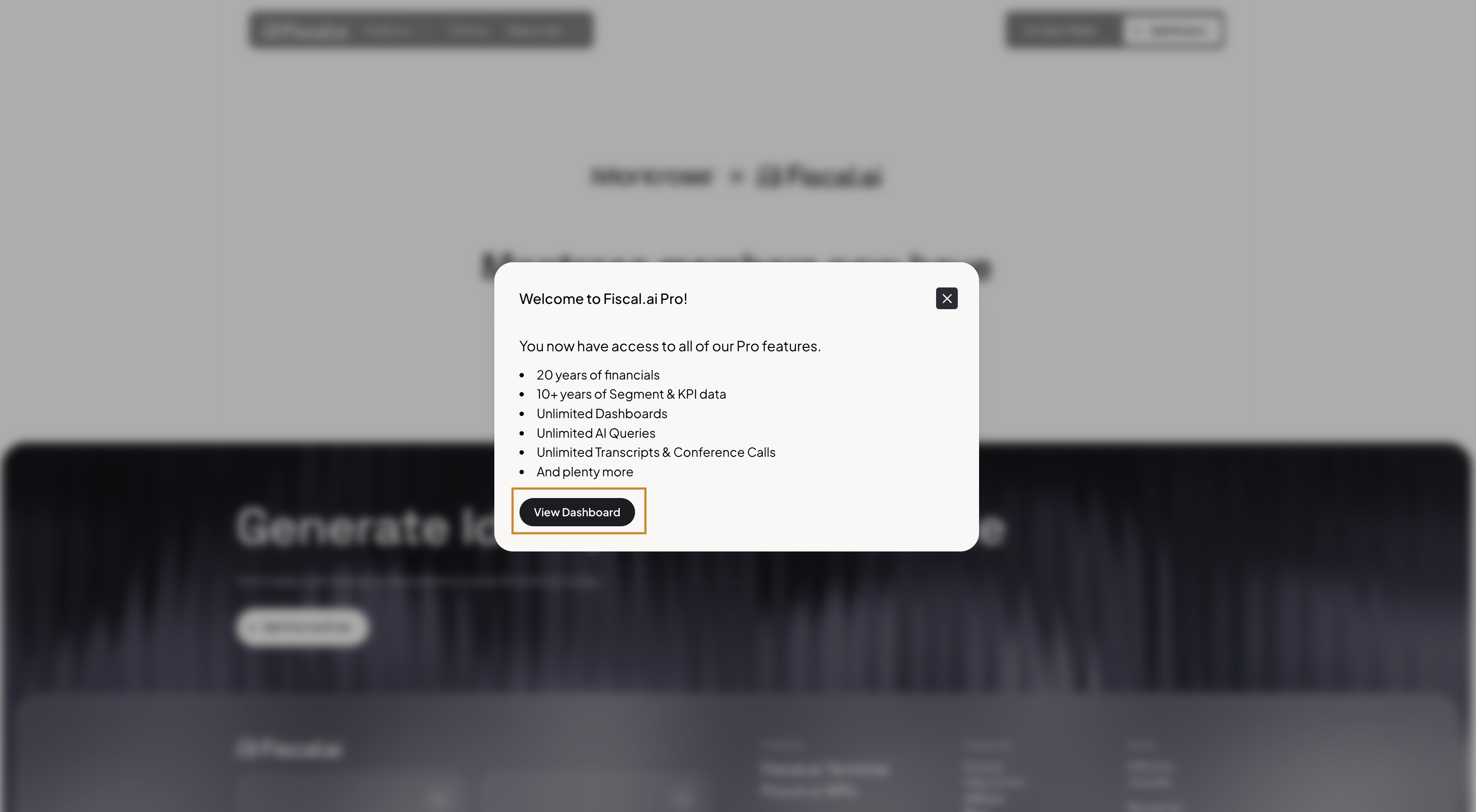 När du är inloggad öppnas en bekräftelseruta. Klicka på “View Dashboard” för att slutföra aktiveringen och gå vidare till Fiscal.ai-terminalen.