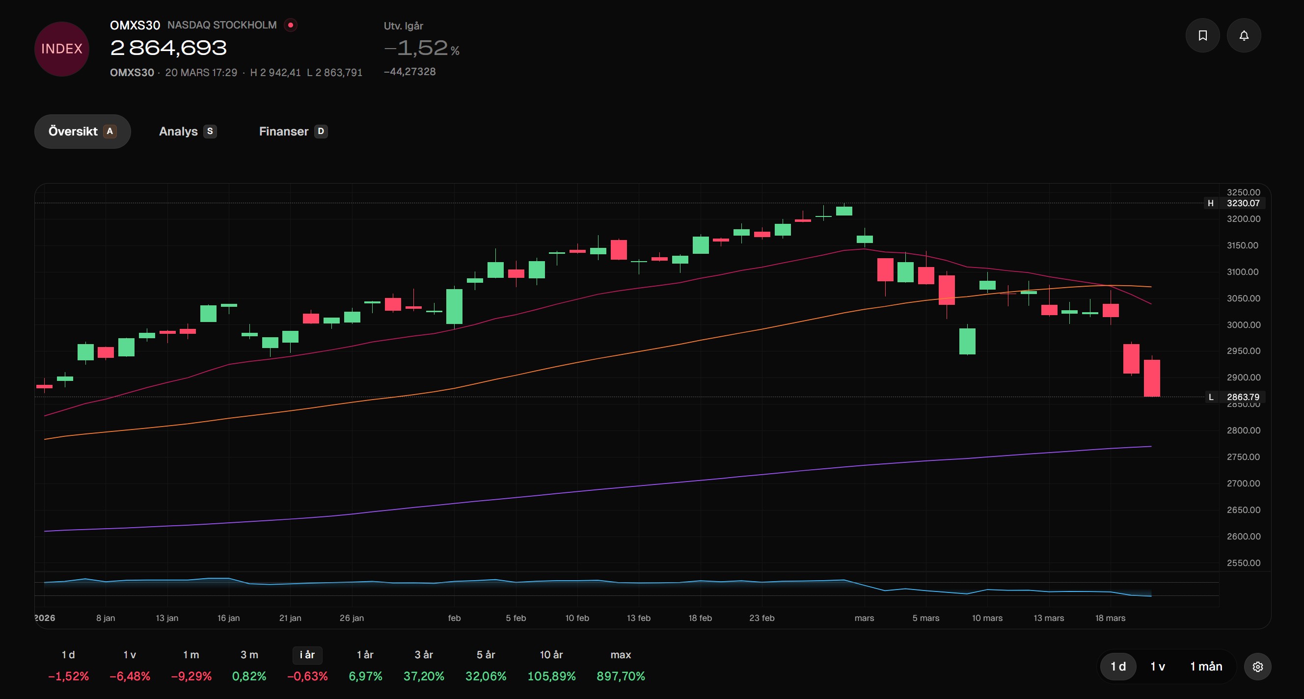 Stockholmsbörsen (OMXS30) har tagit rejält med stryk sedan konflikten i Mellanöstern bröt ut den 28 februari. Årshögsta noterades så sent som fredagen den 27 februari efter en uppgång på 12,04 %. Sedan dess har vi lämnat tillbaka hela uppgången och mer därtill. Index befinner sig nu i negativt territorium för helåret 2026. Den genomsnittliga nedgången för bolagen på OMXS30 uppgår till 14 % och hela 20 % för breda börsen.