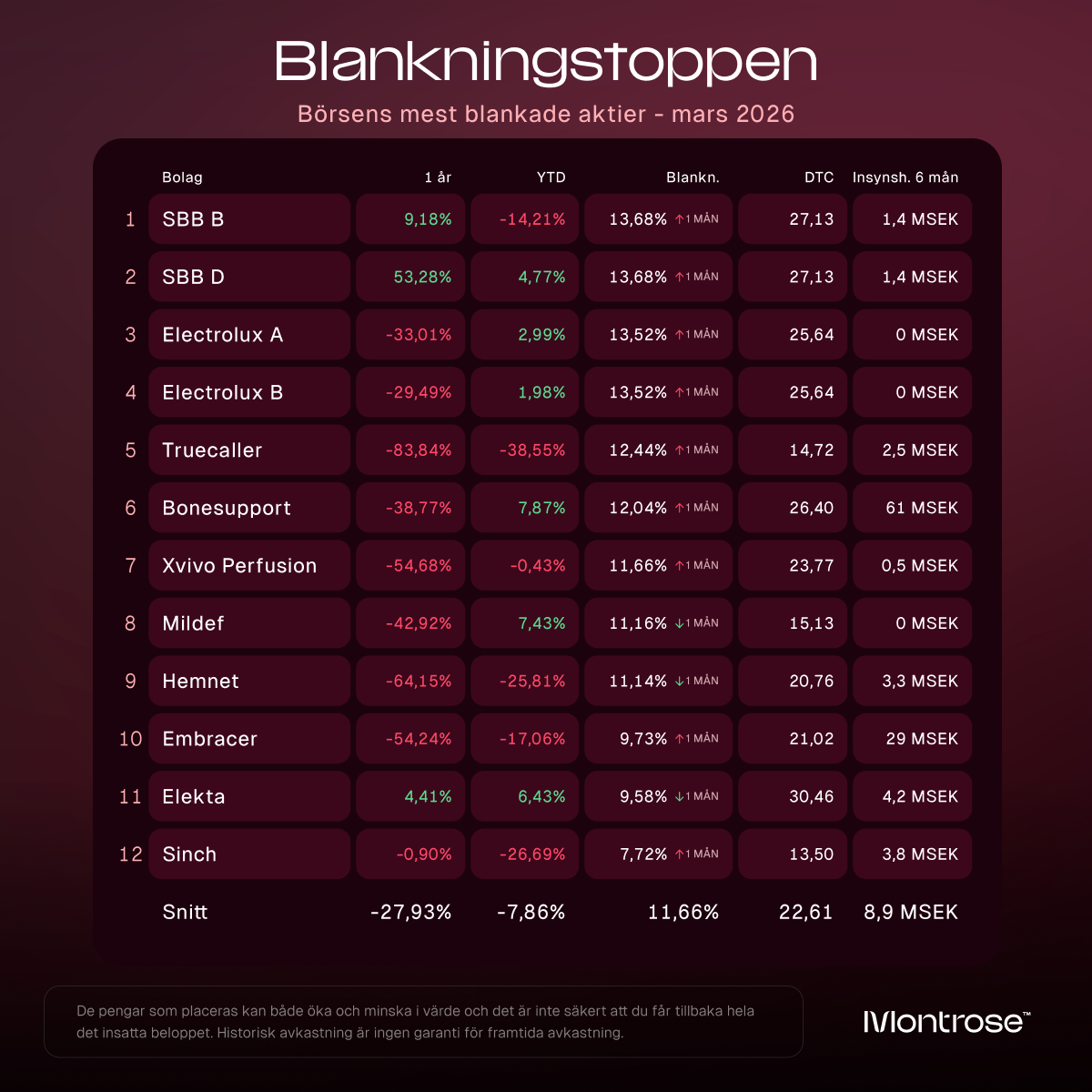 Tabellen visar även hur aktierna utvecklats i år och senaste året, hur stor andel av kapitalet som är blankat, hur många dagar det tar att köpa tillbaka aktierna över marknaden givet genomsnittlig daglig handelsvolym på primärmarknaden samt hur bolagets insynspersoner agerat senaste halvåret.