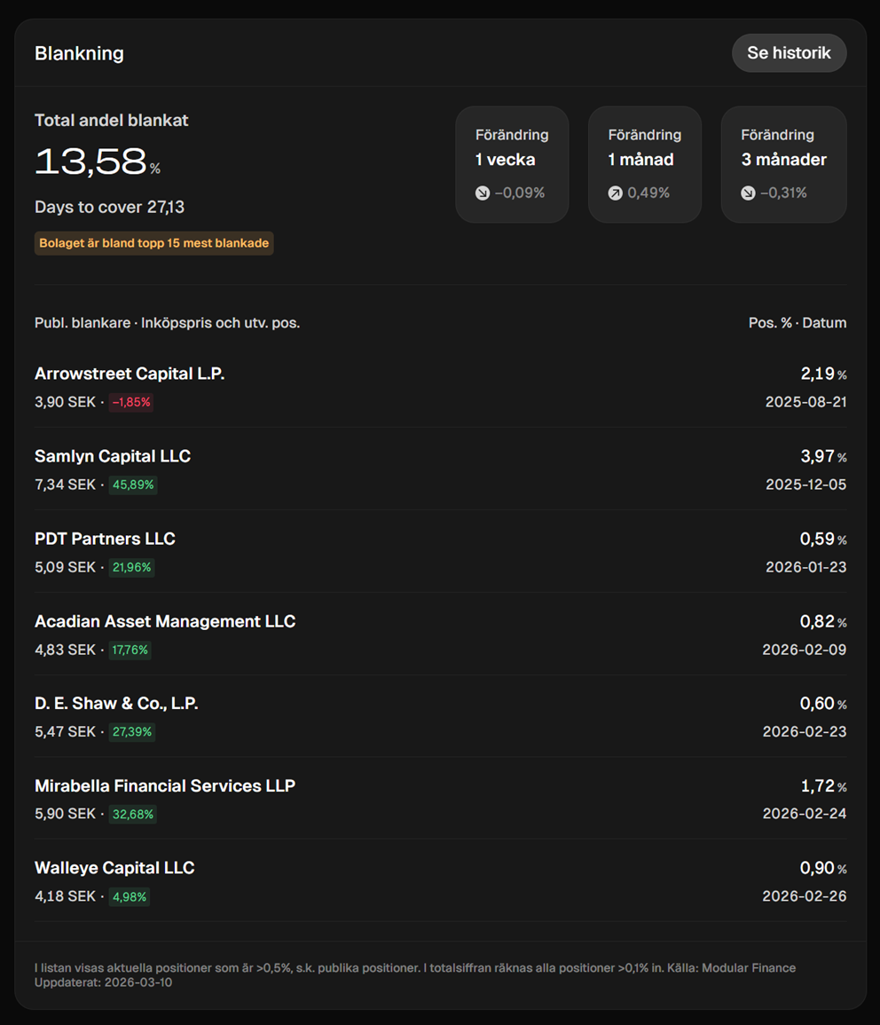 Stockholmsbörsens mest blankade aktier – mars 2026
