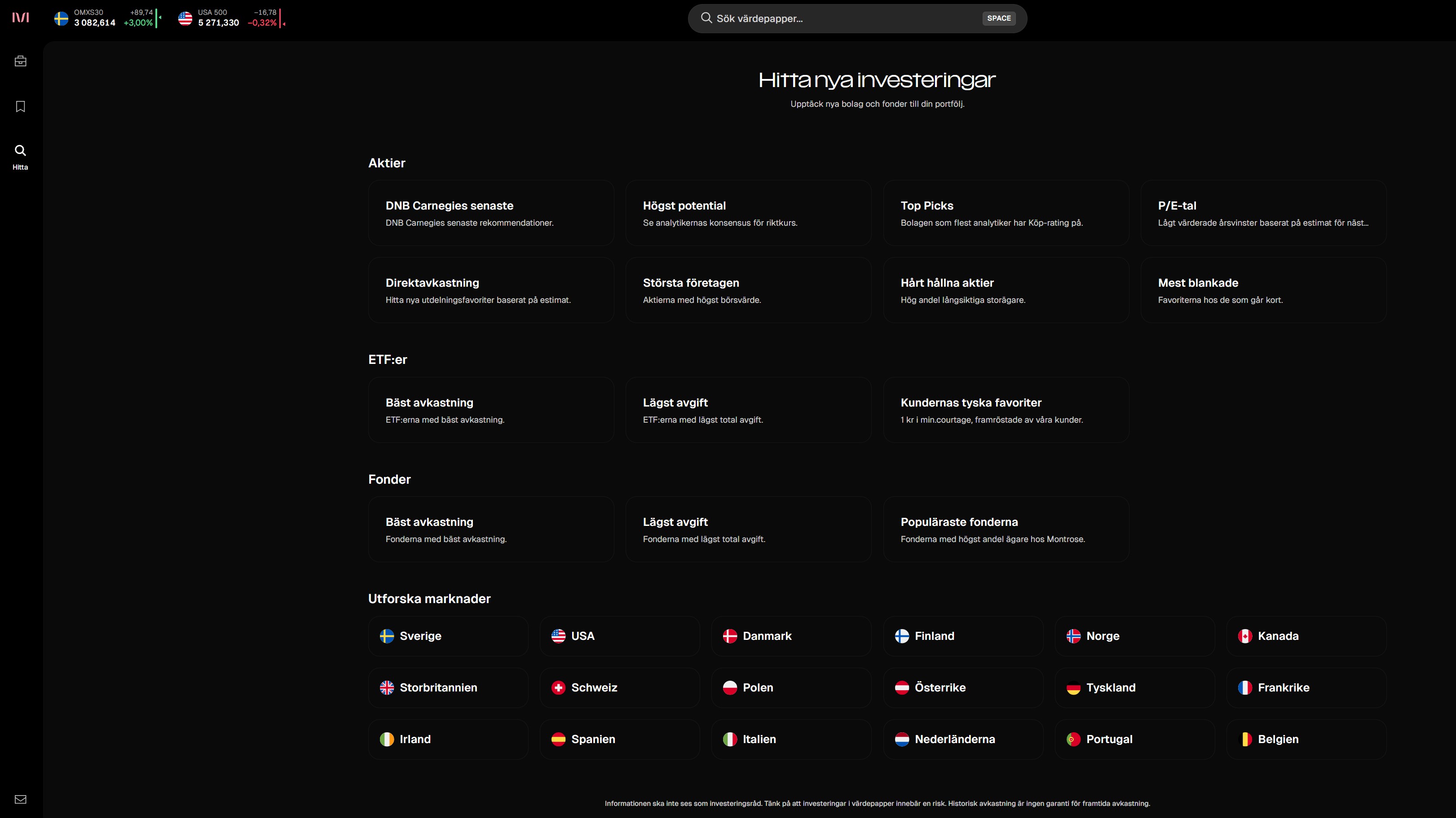 Så var hittar man då informationen om de mest blankade aktierna på börsen? Våra kunder hittar det på desktop genom att trycka på förstoringsglaset i vänsterkolumnen och sen välja listan "Mest blankade".