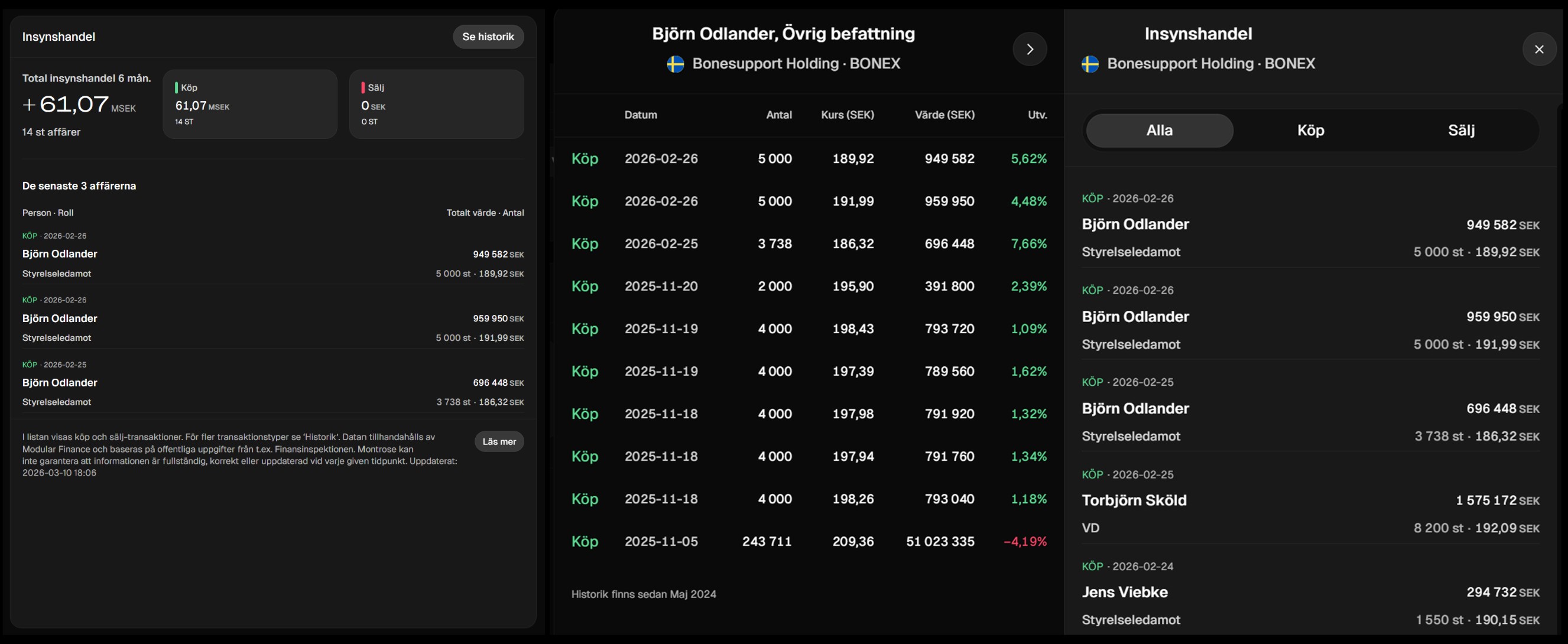 Vi anser att denna information är ack viktig så därför tillgängliggör vi den på plattformen. Låt oss titta närmare på Bonesupport, alltså den aktien på marslistan som vi sett störst insynsköp i senaste halvåret. Via desktop kan du se information om total insynshandel senaste halvåret, fördelning på köp/sälj, vilka personer som köpt/sålt och sist men inte minst min favorit - fördjupningen av enskilda individers transaktioner. Där kan du se de senaste köpen samt utvecklingen sedan köp, aldrig har det varit enklare att hitta börsens bästa insynsköpare.