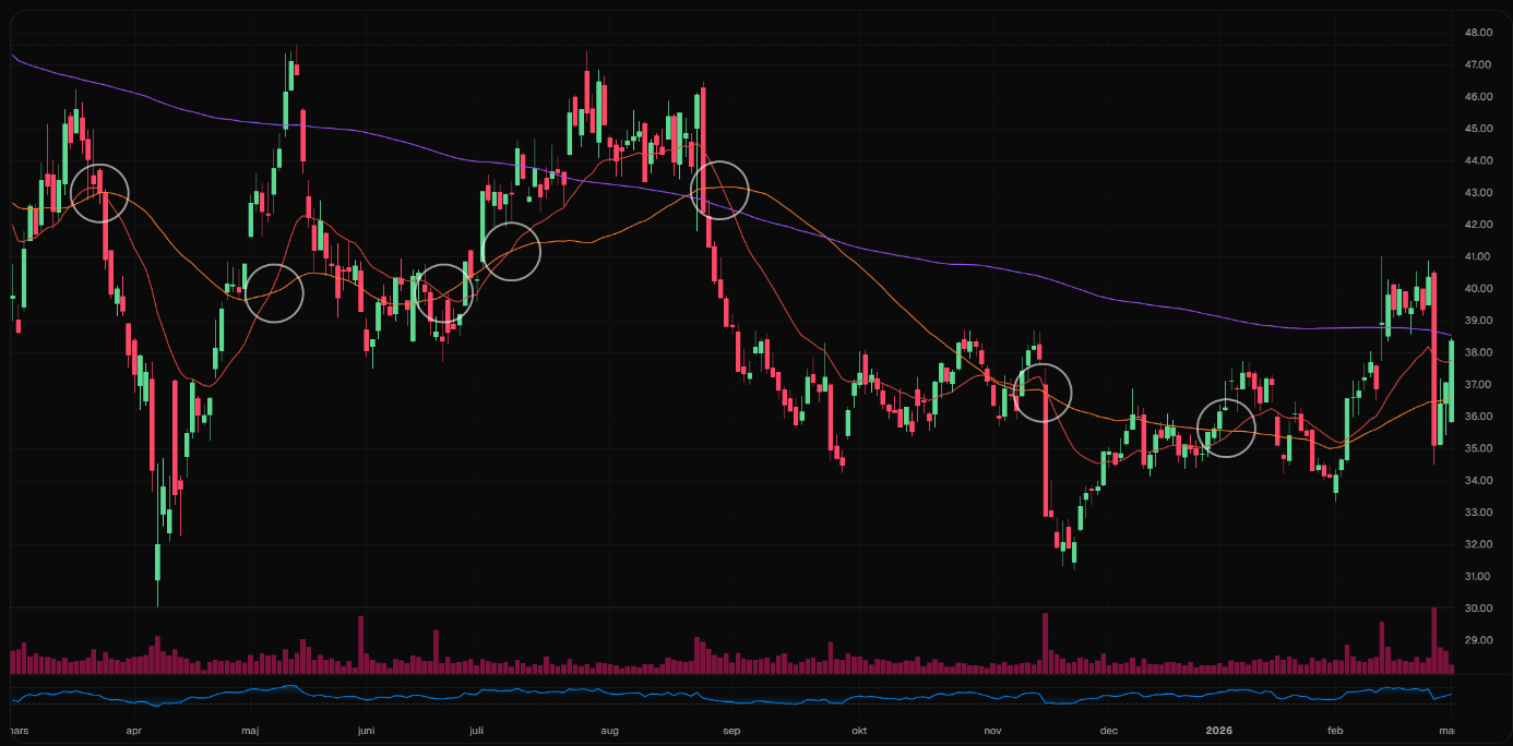 Låt oss använda Nibes kursgraf från det senaste året för att illustrera skillnaderna. Här representeras det lite långsammare SMA200 av den lila linjen, medan den orangea linjen visar SMA50. Den röda linjen visar det mer snabbrörliga EMA20, vilket tydligt illustrerar hur olika indikatorer reagerar på samma prisrörelse.