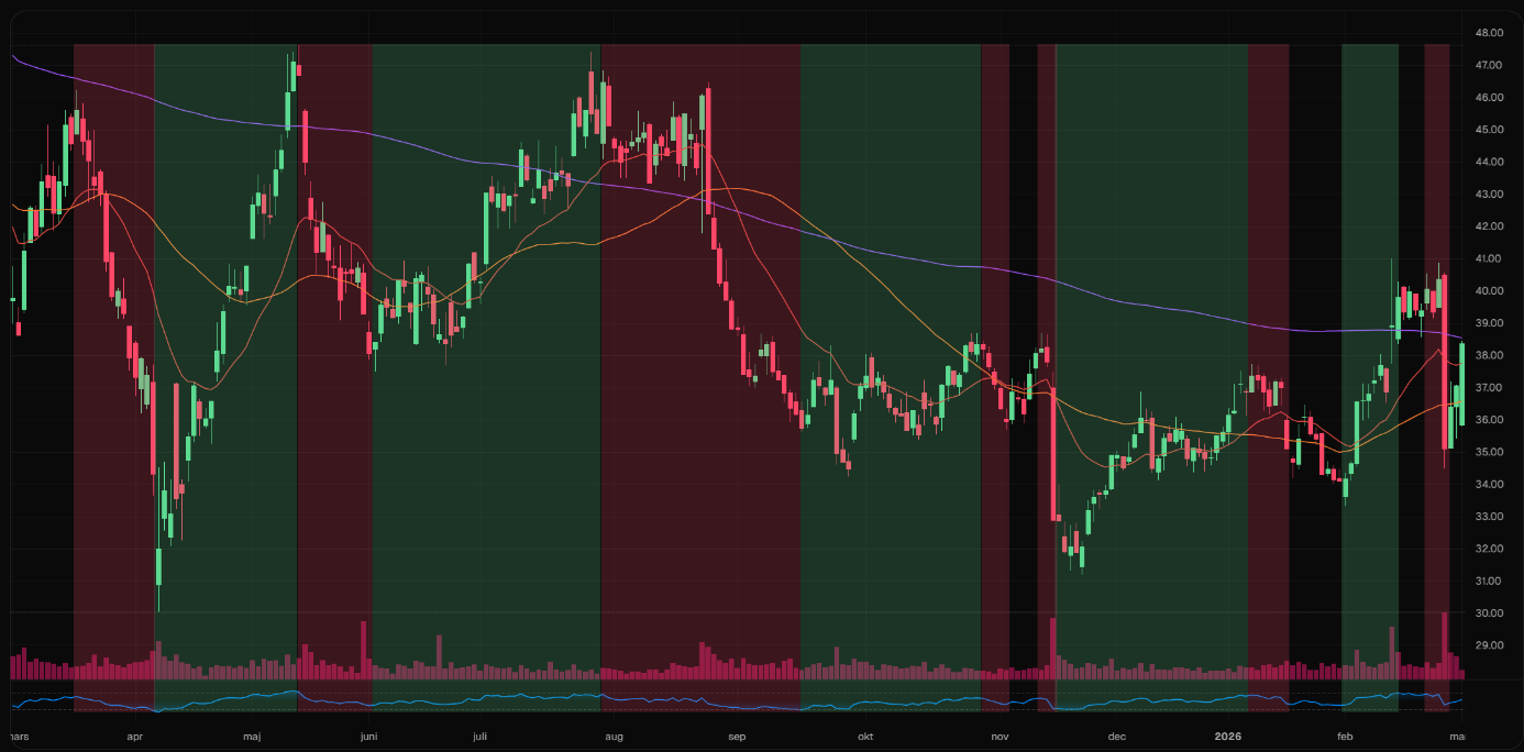 Ett intressant köptillfälle kan uppstå när en aktie i en etablerad och positiv primärtrend (över MA200) genomgår en tillfällig rekyl som testar nedre Bollingerbandet, samtidigt som RSI indikerar översålda nivåer under 30. Det här signaliserar att säljtrycket är uttömt och att sannolikheten för en studs uppåt är relativt hög.